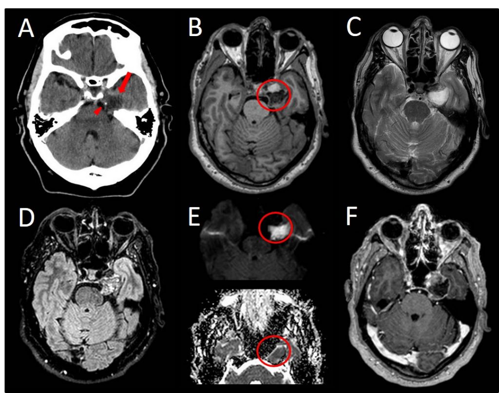 Varón de 65 años, consulta por cifras tensionales altas y cefalea. Se realiza TC objetivándose imagen sugestiva de LOE intracraneal (imagen A). Posteriormente RM.