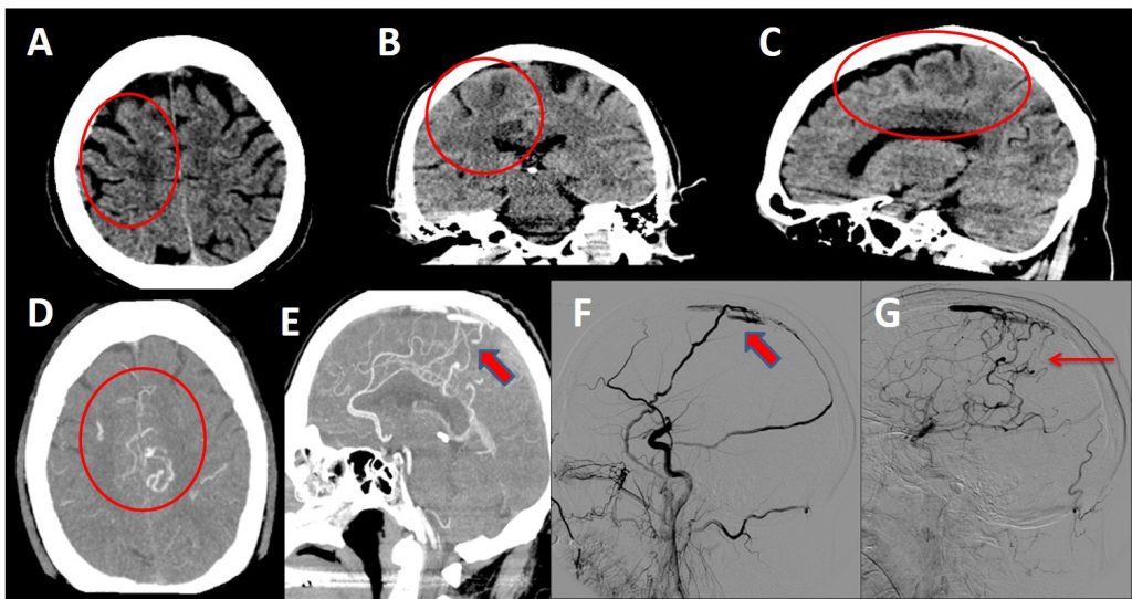 F-G. Arteriografía selectiva de ACC derecha donde se observan ramas frontal y parietal de arteria meníngea media derecha comunicando con tercio medio del seno sagital superior, produciendo su relleno precoz a dicho nivel, con drenaje a venas corticales dilatadas y ectásicas.