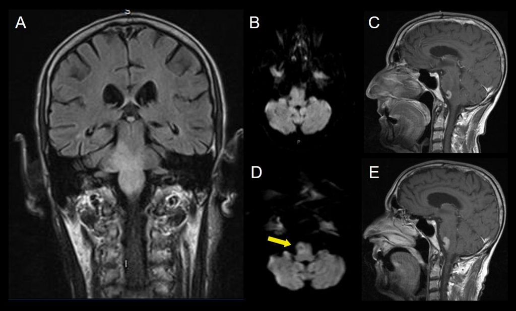 - Varón de 67 años sin AP de interés. Consulta por diplopía binocular, disartria y marcha inestable. TC urgencias normal. Se realiza RM, se inicia Metilprednisolona. Tras empeoramiento clínico se realiza nueva RM. El paciente fallece a los 15 días de la 2º RM.
