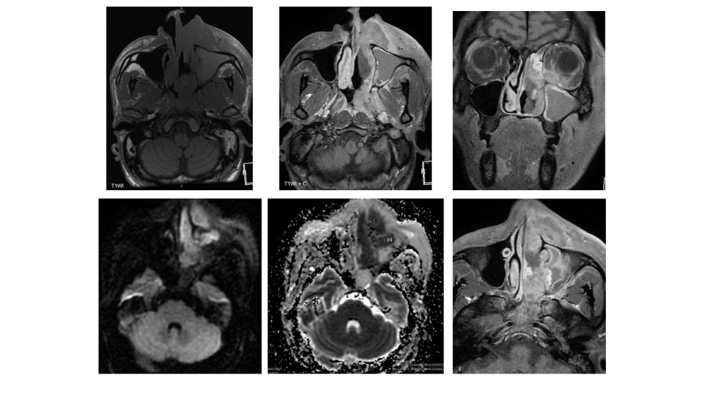 La RM suele mostrar una masa de tejido blando infiltrante y mal definida, con señal heterogénea en secuencias T1 y T2, y restricción a la difusión. A menudo hay componente necrótico presente.