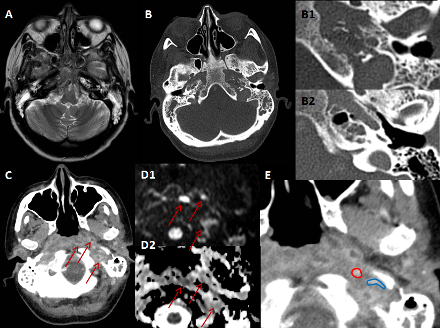 Para el diagnóstico es importante la valoración del hueso mediante TC, en la que se demuestran erosiones en el hueso con ocupación de las celdillas del ápex petroso y con realce periférico en los abscesos de partes blandas.