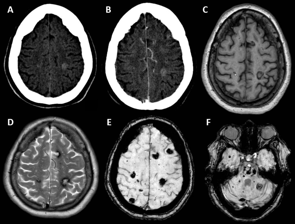 E, F: Susceptibilidad magnética (SWI), axial a diferentes niveles: Las lesiones se hacen más llamativas y se objetivan otras de tamaño milimétrico que no se apreciaban en las otras secuencias, de forma generalizada por todo el parénquima. Estas lesiones son marcadamente hipointensas, lo que se traduce en  restos de hemosiderina secundarios a múltiples microsangrados.