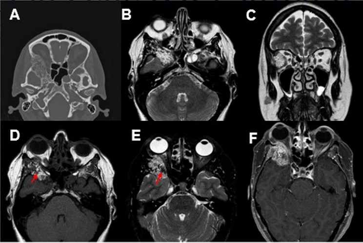 A. TC, axial: Lesión osteolítica de aspecto multiseptado que remodela las alas del esfenoides y pared lateral de la órbita derecha sin signos de agresividad (de márgenes lobulados y bien delimitada, no reacción perióstica ni disrupción cortical).