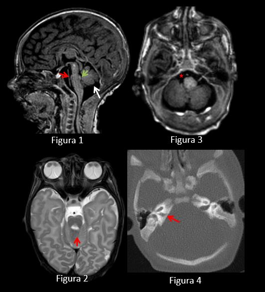 Figura 1: RM secuencia sagital T1. Aplanamiento ventral de la protuberancia (flecha roja) y protrusión del tegmento pontino (“tegmental cap”) hacia el cuarto ventrículo (flecha verde). Vermis hipoplásico con alteración de la foliación (flecha blanca).