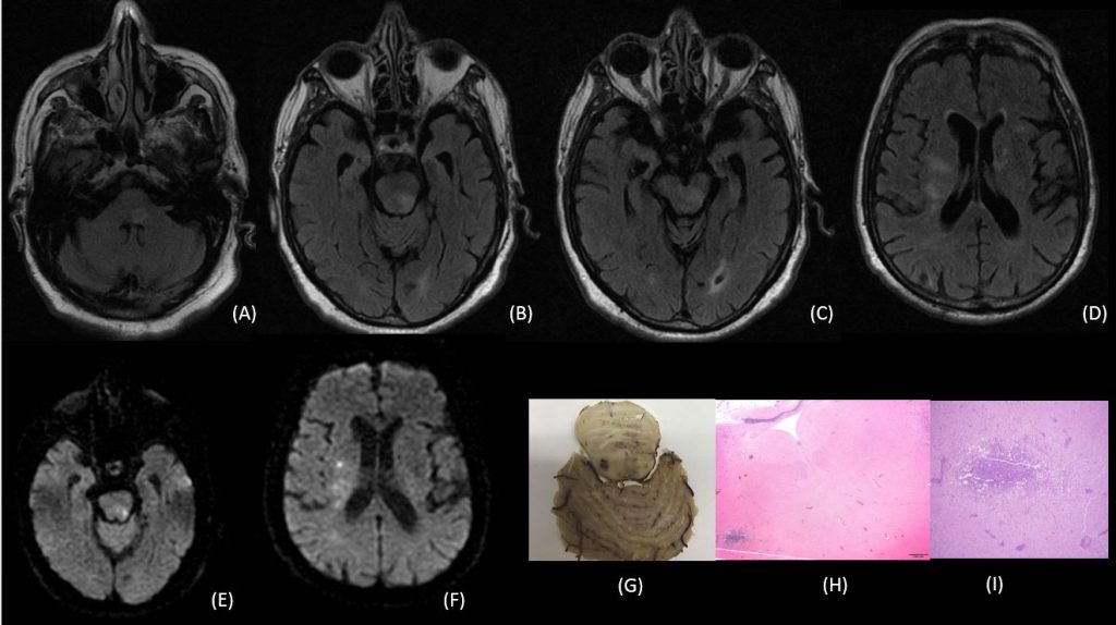Figuras E y F son secuencia de difusión, en que existe focos de restricción a la difusión en la región dorsolateral izquierda de la protuberancia y sustancia blanca periventricular derecha.