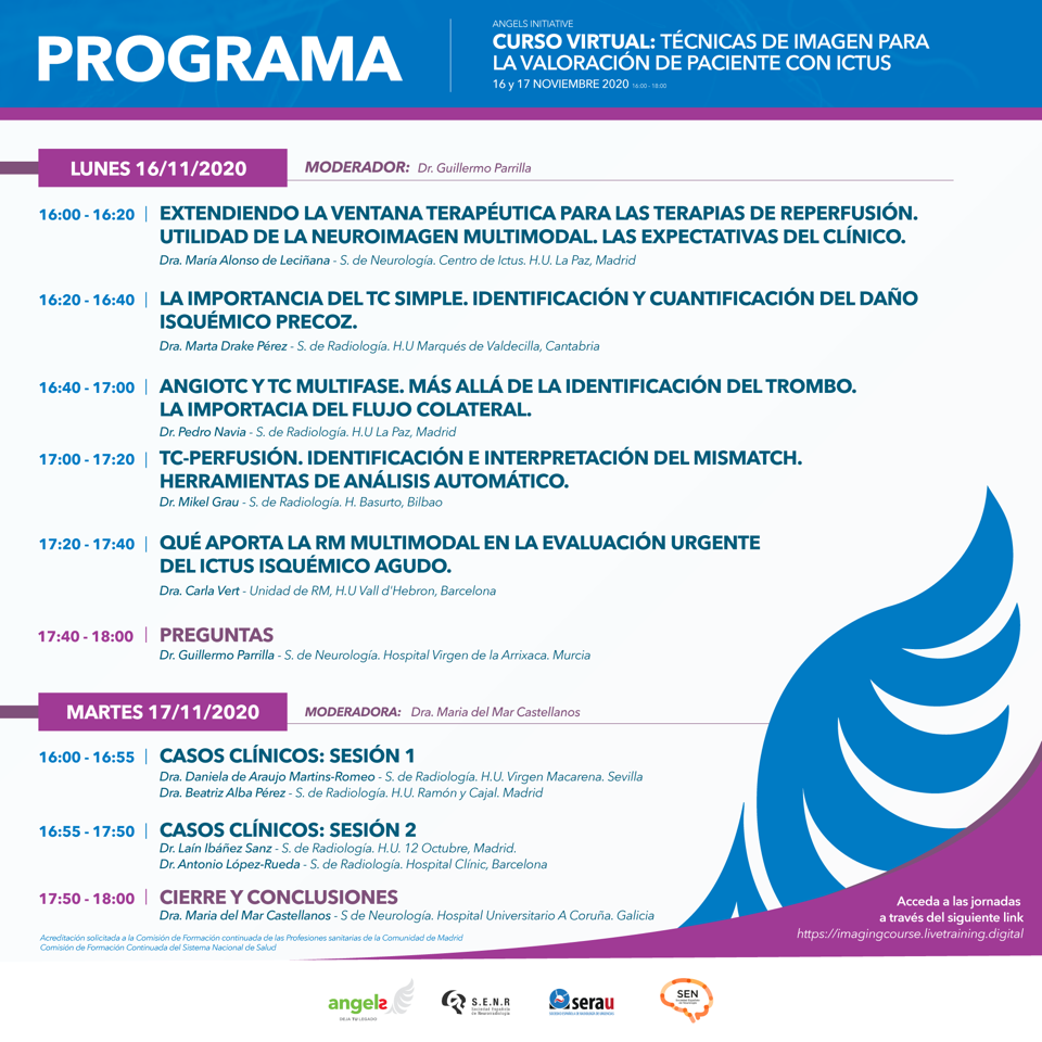 «Los próximos días 16 y 17 de noviembre se celebrará de manera virtual el curso «Curso virtual: Técnicas de Imagen para la valoración de paciente con ictus» con un interesante programa que puedes consultar aquí «https://imagingcourse.