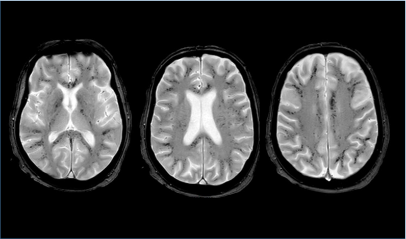 Cortes axiales en ponderación T2 FFE de una RM cerebral realizada 41 días tras el ingreso en la UCI. Numerosos microsangrados están involucrando difusamente la substancia blanca yuxtacortical, el cuerpo calloso y las cápsulas internas. La sustancia blanca profunda y periventricular así como la sustancia gris están respetados. Estas micro hemorragias no son visibles en las otras secuencias (T1, FLAIR, difusión)