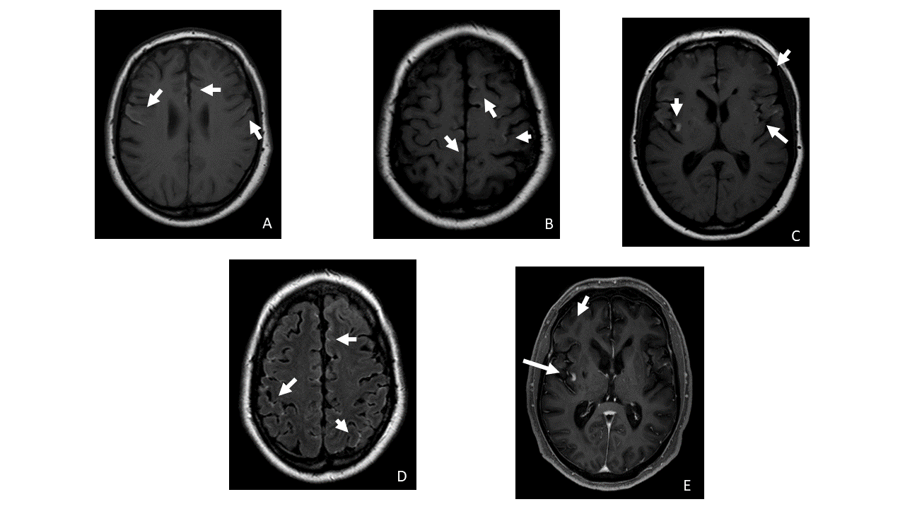 Figuras A, B y C. RM cerebral, secuencias ponderadas en T1, cortes axiales. Figura D-FLAIR axial. Áreas de hiperseñal en la superficie cortical supratentorial de los surcos y circunvoluciones de la convexidad frontal, temporal e insular bilateral