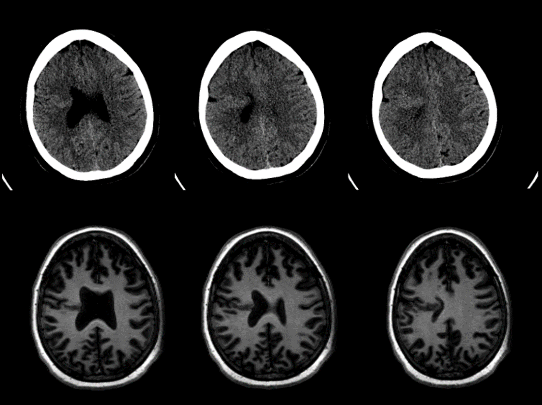 Fila superior: cortes axiales de TC de cráneo simple y Fila inferior cortes axiales de RM de cráneo en secuencia T1.