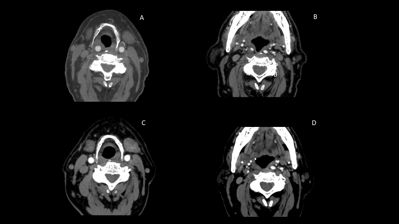 Fig. C-D. AngioTC de control que muestra lateralización de arteria carótida común e interna derecha (con desaparición del trayecto retrofaríngeo). Además existe progresión del grado de estenosis.