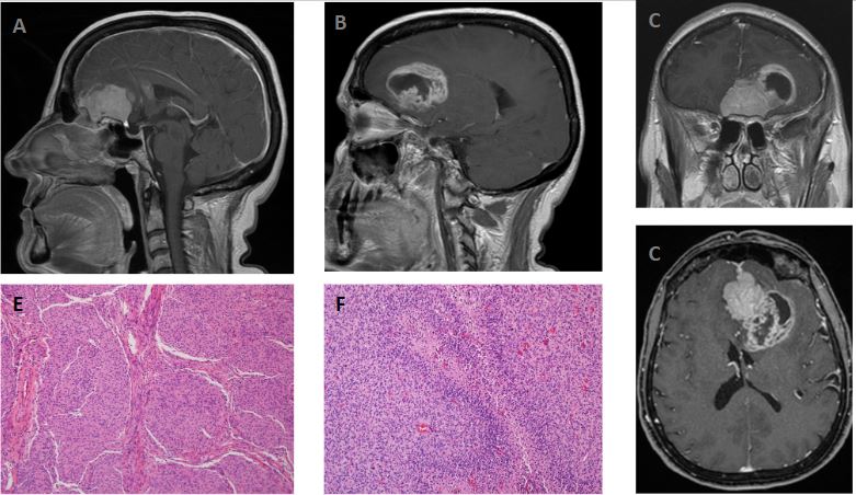 Figura A: RM cerebral potenciada en T1 con CIV en el plano sagital en la que se observa lesión sólida extraaxial con base de implantación en la lámina cribosa y surcos olfatorios bilaterales, que realza intensa y homogéneamente.