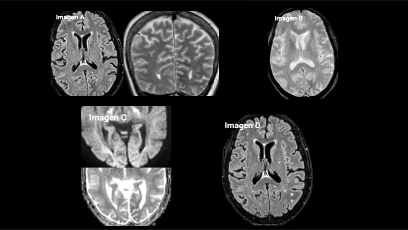 En las RM se identifica una hipointensidad en T2 y FLAIR en la sustancia blanca subcortical del lóbulo occipital afecto, junto con ligera hiperintensidad de la cortical adyacente. En una secuencia T2 eco-gradiente también aparece una hipointensidad de la sustancia blanca. En la difusión se puede objetivar una ligera hiperintensidad de la cortical adyacente. Tras la administración de contraste, se observa un realce leptomeníngeo en región parieto-occipital.