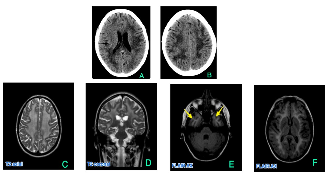 TC de cráneo, cortes axiales (Imágenes A y B). Se observa hipodensidad de la sustancia blanca subcortical de forma generalizada y bilateral. En base a estos hallazgos se pide una RM.