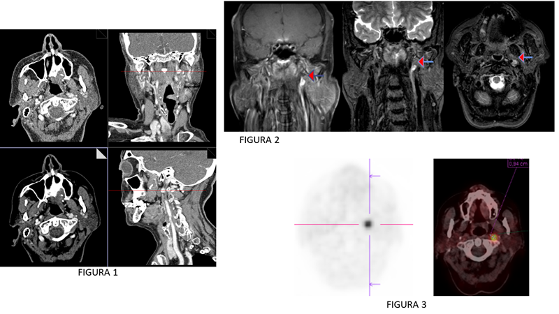 Se confirma lesión tumoral hipervascular retrofaríngea, paraestiloidea izquierda, en íntimo contacto con ACI tanto en TC con CIV (marcado realce) como en RMN (hiperintensa en T2-STIR y con realce tras gadolinio), y se decide extirpación quirúrgica.