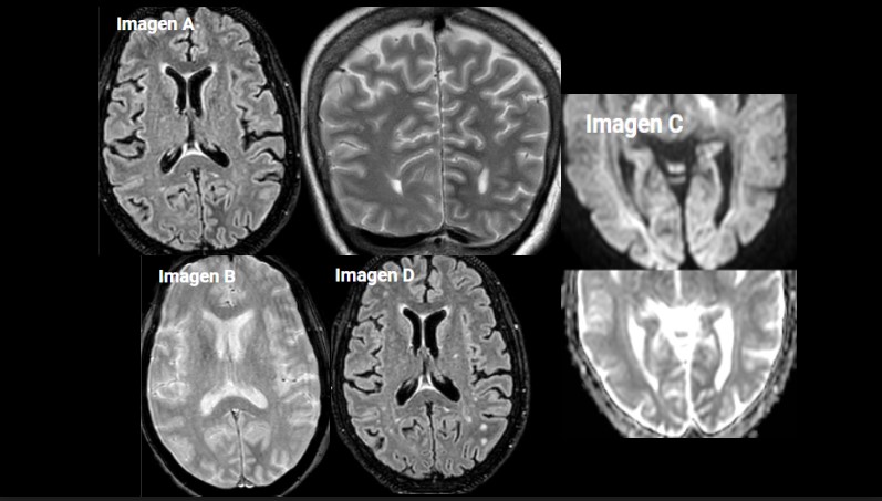 En las RM se identifica una hipointensidad en T2 y FLAIR en la sustancia blanca subcortical del lóbulo occipital afecto, junto con ligera hiperintensidad de la cortical adyacente. En una secuencia T2 eco-gradiente también aparece una hipointensidad de la sustancia blanca. En la difusión se puede objetivar una ligera hiperintensidad de la cortical adyacente. Tras la administración de contraste, se observa un realce leptomeníngeo en región parieto-occipital.