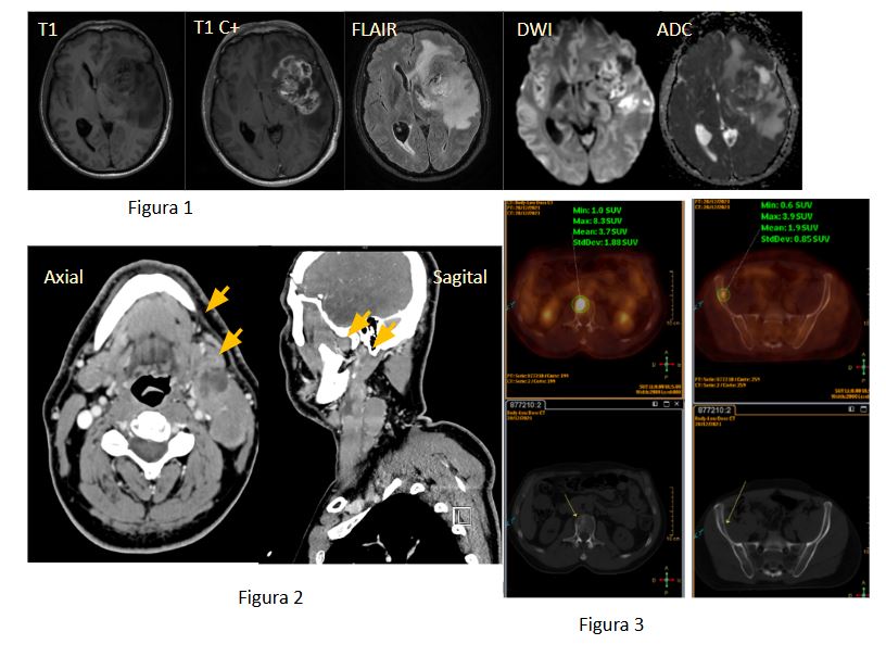 Los hallazgos cerebrales hacen relación a un Glioblastoma IDH wild type confirmado mediante anatomía patológica tras la resección del tumor. El paciente se somete a tratamiento estándar con cirugía seguido de radioterapia y quimioterapia adyuvante. Dos meses más tarde tras el diagnóstico inicial, presenta unas adenopatías laterocervicales de aspecto patológico, tributarias de PAAF, donde se confirma que se trata de metástasis de glioblastoma. El diagnóstico diferencial incluye adenopatía metastásica de un tumor escamoso de cabeza y cuello o una adenopatía reactiva por infección.
