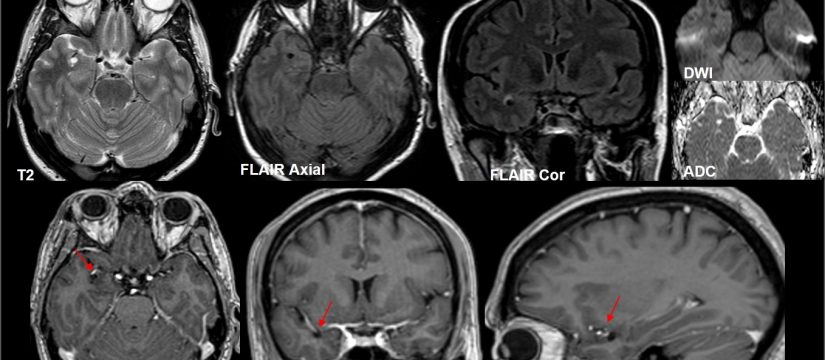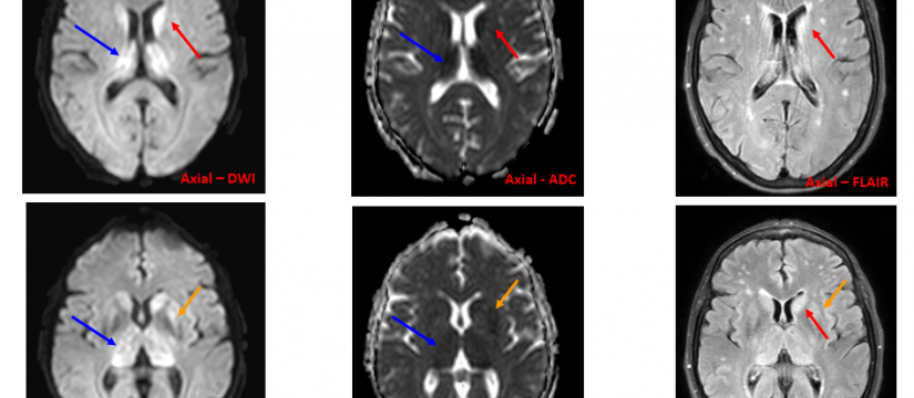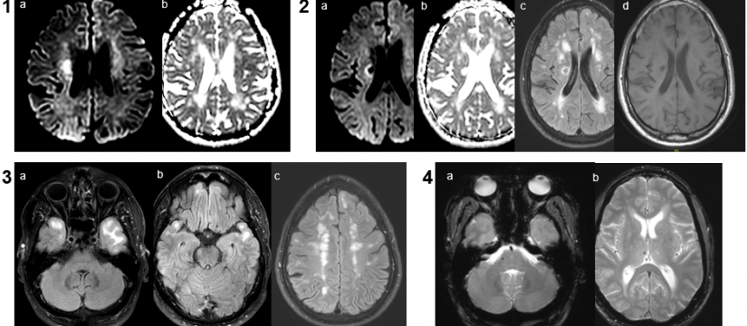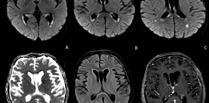 Mujer de 69 años de edad, con un cuadro de 7 meses de inestabilidad cefálica y de la marcha. Se realiza una RM craneal inicial, que es normal. Progresivamente, la síntomatología empeora, añadiéndose desorientación, alucinaciones, mioclonías y deterioro cognitivo. Se repite RM craneal por empeoramiento clínico progresivo.